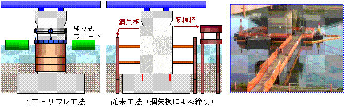 本工法は仮締切などの仮設工事が不要であり、掘削は鋼板と既設橋脚とのわずかな隙間に限定される工費・工期・環境に優れた工法です。